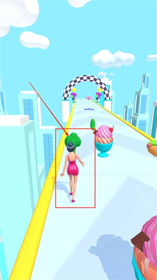 1. 操控身着红色连衣裙的女孩,让她在黄色跑道上奔跑,避开绿色树形的障碍物,收集粉色的冰淇淋道具,向着设有黑白拱门的终点进发。