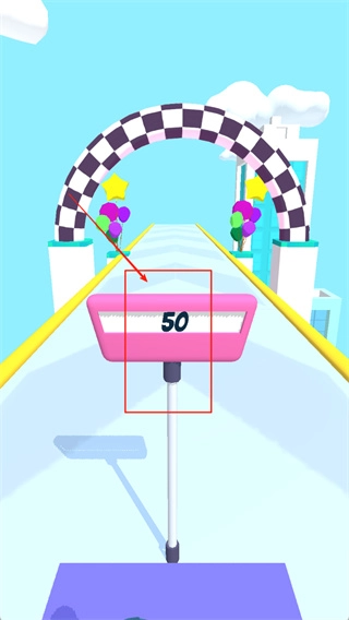 2、留意中间的粉色进度条,其上显示的数值为50分。进度条的背景是黑白拱门搭配彩色气球,而跑道两侧的黄色边线十分清晰。