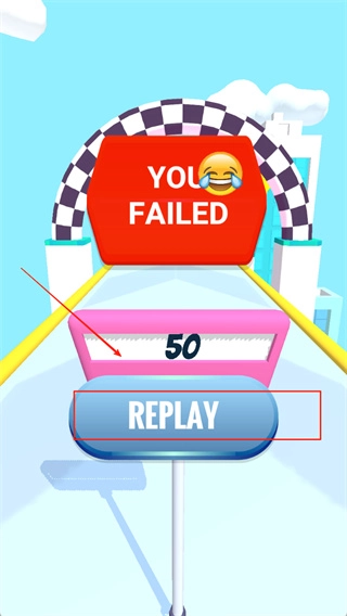 3、当看到红色的“YOU FAILED”提示以及50分的时候,点击蓝色的“REPLAY”按钮,就能重新游玩,此时背景中有拱门和白色建筑。