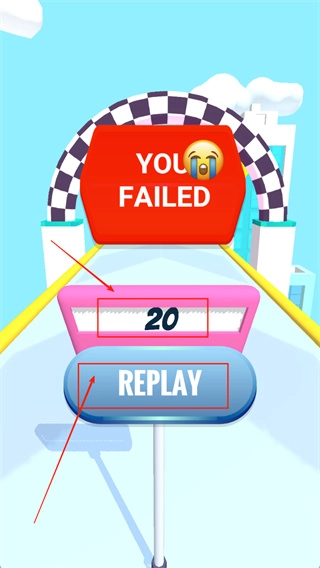 4、上方呈现红色的“FAILED”提示以及20分的显示,下方蓝色的“REPLAY”按钮可点击,红色箭头指向分数与重玩选项。