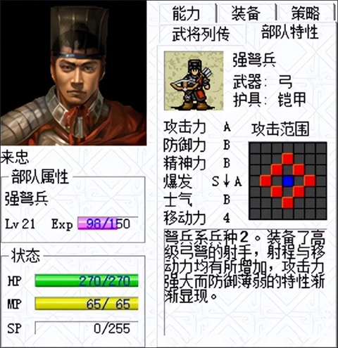 弓兵进阶为长弓兵,最终可成为神射手(ABBBS) 。他们擅长远距攻击,很容易射出致命箭矢,对骑乘部队和戟兵有克制效果,但惧怕步兵系兵种。作战时使用弓。