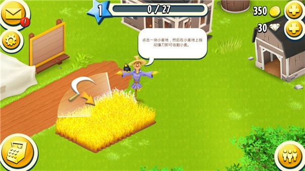 4、按照教程提示,点击小麦,选择镰刀,然后拖动镰刀收割整片小麦。
