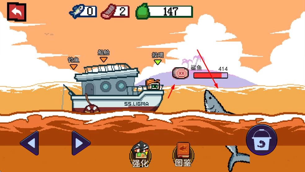 3、回到主界面,可投喂鲨鱼积累资源,点击强化按钮,消耗资源升级鱼竿等渔具。