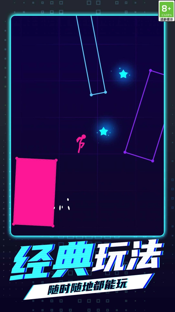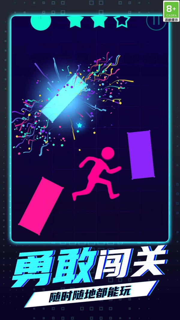 《跳来跳去》是一款极具极简风格的跑酷手游。在游戏里,玩家需要操控几何形状的火柴人角色,于由单色构建而成的赛博空间场景中,施展二段跳、墙反、滑铲等一系列高难度动作。此游戏匠心独运地设计了色彩唤醒机制,每当火柴人触碰霓虹方块,便会瞬间激活所在区域的特效,而收集四处散落的星芒,还能够解锁隐藏的剧情内容。《跳来跳去》运用了动态物理引擎,使得火柴人的每一个动作,都会像墨迹晕染一般留下粒子残留效果,再配合犹如电子脉搏般的背景音效,共同营造出别具一格的禅意竞技体验。