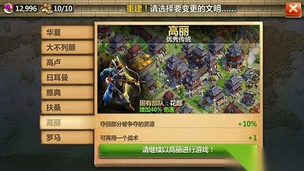 7、高丽:高丽民族在进攻与资源经济方面各有侧重。其独特之处在于,能够夺回部分被掠夺的资源,从而更有效地保障自身发展。在进攻作战时,还可额外启用一种战术,这常常成为决定胜负的关键因素。固有部队为花郎,该部队特色是伤害增加40%,属于极为强悍的远程兵种之一。