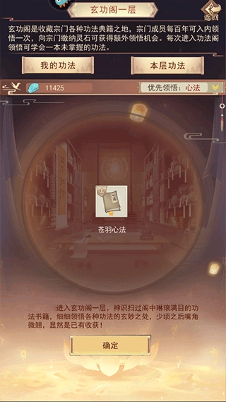 在门派藏经阁的玄功阁内,能够研习门派所珍藏的功法。门派职务的高低,决定了可进入玄功阁的层数,职务越高,进入层数越多,所能学习的功法星级也就越高。修炼者可选择优先尝试领悟某一类型的功法,不过即便如此,依然存在领悟到其他类型功法的可能性。
