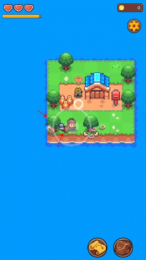 2、游戏初始状态下,玩家身处一小块岛屿。岛屿下方的圆圈图标,用于操控角色的移动方向;右下方的地图图标,可花费金币来拓展岛屿面积。书包图标既能收纳物品,也能通过出售物品获取金币。左上角的爱心与进度条,分别代表角色的体力和能量,而右上角显示的金币数量当前为零。