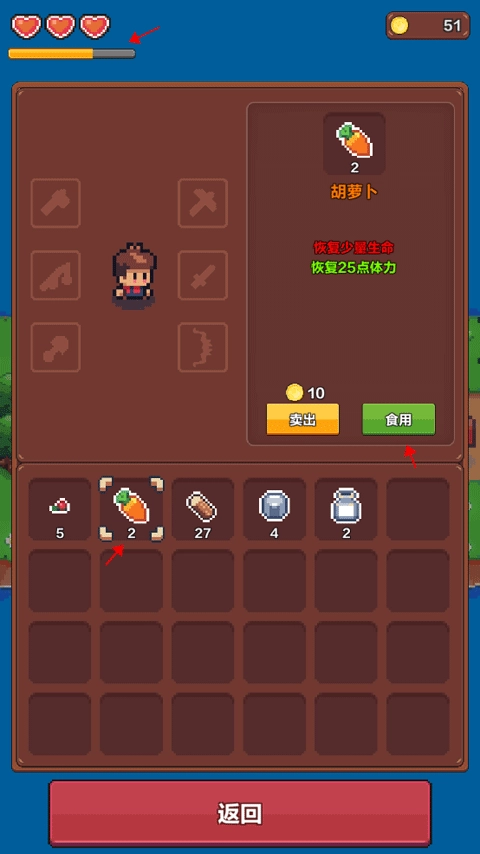 8、要是你发现自己的体力进度条已消耗大半,此时可点开书包里的食物,会出现“食用”选项,点击该选项,你的体力就能恢复啦。