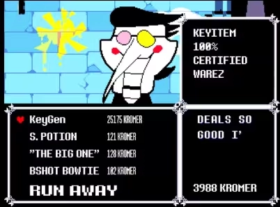 Spamton本体是kris独自面对的那个推销员。首先见到斯潘顿本体以后走非暴力路线,靠交易取胜(跟饶恕一样)