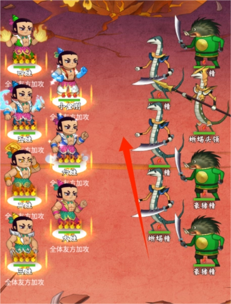 1. 兄弟阵容编排:依据妖怪的属性和技能,科学合理地安排葫芦兄弟的出战顺序。比如,当遭遇远程妖怪时,优先派出二娃去侦查其弱点;要是面对物理攻击型妖怪,则派遣三娃到前排承受伤害,借助技能之间的连贯配合,达成高效降妖的目的。