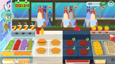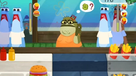 4、把肉饼煎好,接着把煎好的肉饼夹到汉堡里面,做好这些后就可以把汉堡递给顾客。然后用蟹老板的爪子去收集金币。
