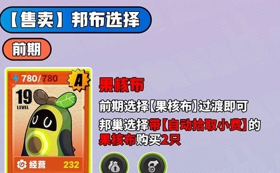 1、售卖过渡(前期):选用A阶「果核布」,邦巢搭配「自动拾取小费」,采购2只维持基础金币产出,满足早期经营消耗。