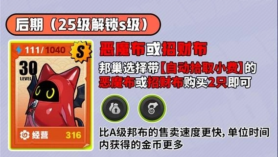 2、后期(25级解锁S级),选择【恶魔布/招财布】,在邦巢挑选带有【自动拾取小费】的,购买2只。因为它们的售卖速度比A级邦布快,所以单位时间内的金币收益更高。