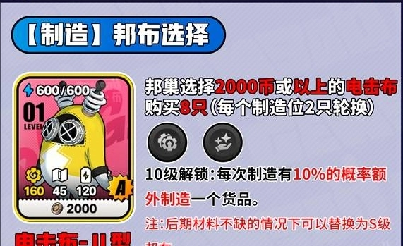 3、制造邦布时,选择价值2000币及以上的【电击布】,购买8只(每个制造位安排2只进行轮换)。当达到10级时,可解锁10%的概率额外制造货品。若后期材料充足,可将其替换为S级邦布。