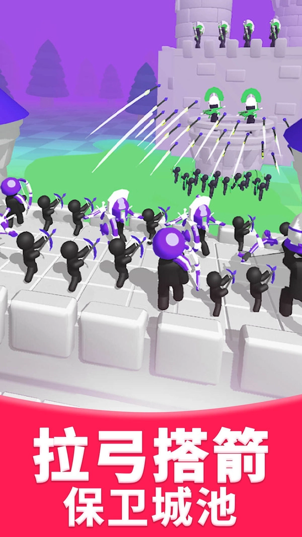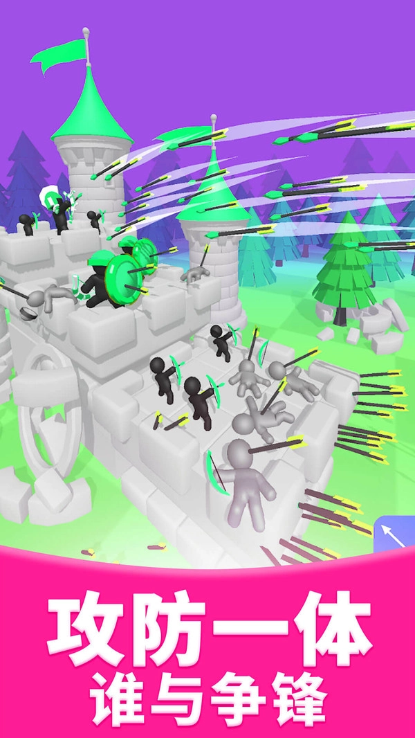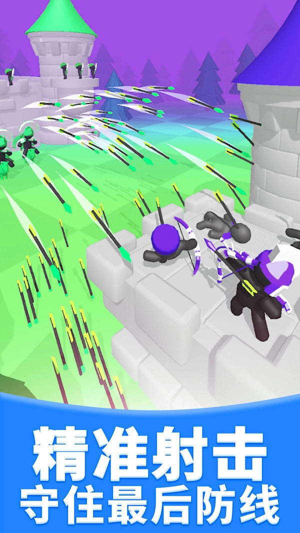 1. 通过滑动屏幕来调整射箭的角度与力度,让箭矢以抛物线轨迹射出,攻击对面城墙上的敌人,一旦射中即可消灭目标。