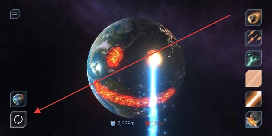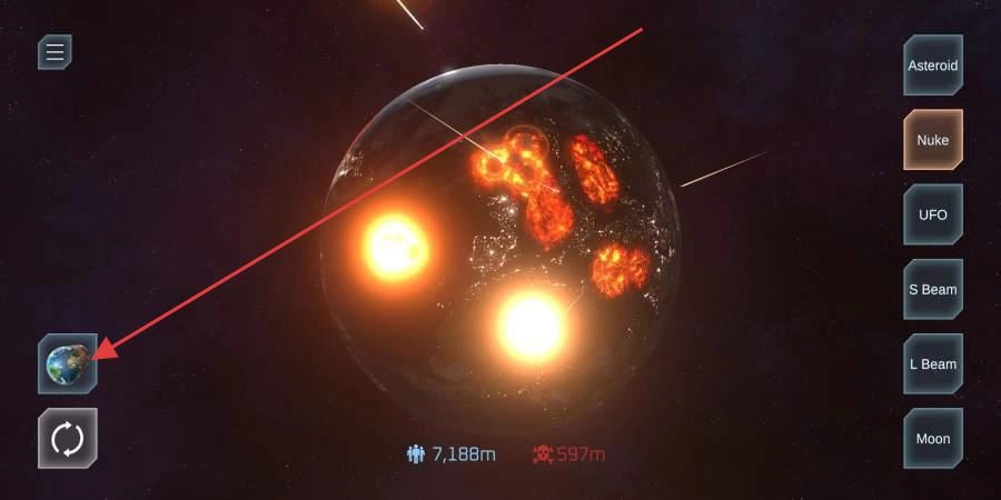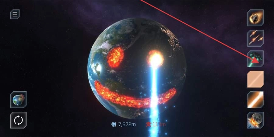 1、武器选择:点击右侧武器栏(陨石、核弹、激光等),了解不同武器效果(如陨石撞击、核弹爆炸范围),按需选择破坏工具。