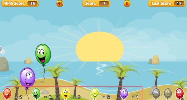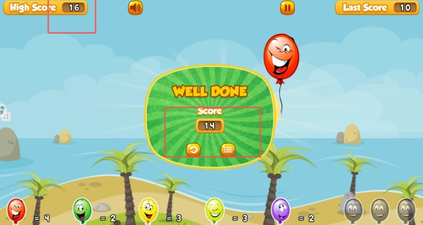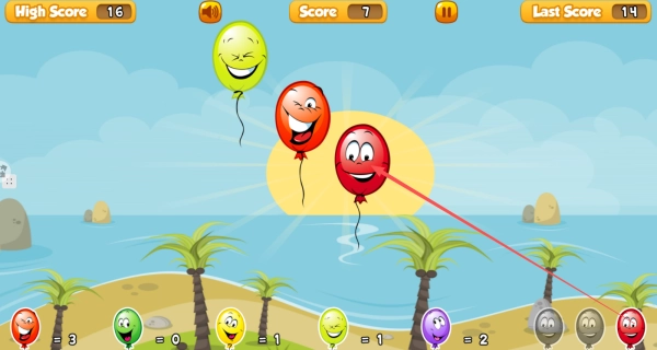2、每次点击不同颜色的气球,所代表的分数各不相同,尽量点击分数高的气球。