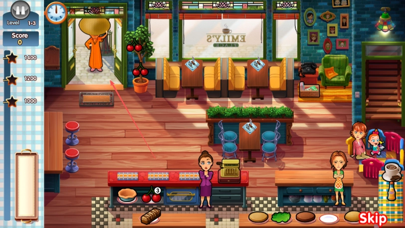 1. 进入《美味餐厅3》游戏的1 - 3关卡,查看画面左侧的Score0分数栏,同时留意进店的顾客,做好服务准备。