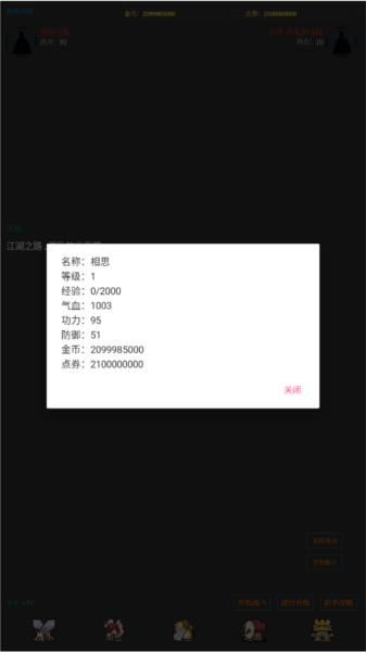 《江湖之路修改版》是一款主打文字的武侠游戏。玩家在其中扮演初涉江湖的侠客,凭借修炼武功、结识各路豪杰以及探索未知之地,一步步成长为武林泰斗。该游戏以文字为依托,用细腻的笔触勾勒出武侠世界的恩怨情仇,让玩家于字里行间领略江湖的热血与激情。无论是战斗、修炼,还是任务等环节,都以文字形式展现,并搭配少量画面与音效,营造出别具一格的武侠氛围。
