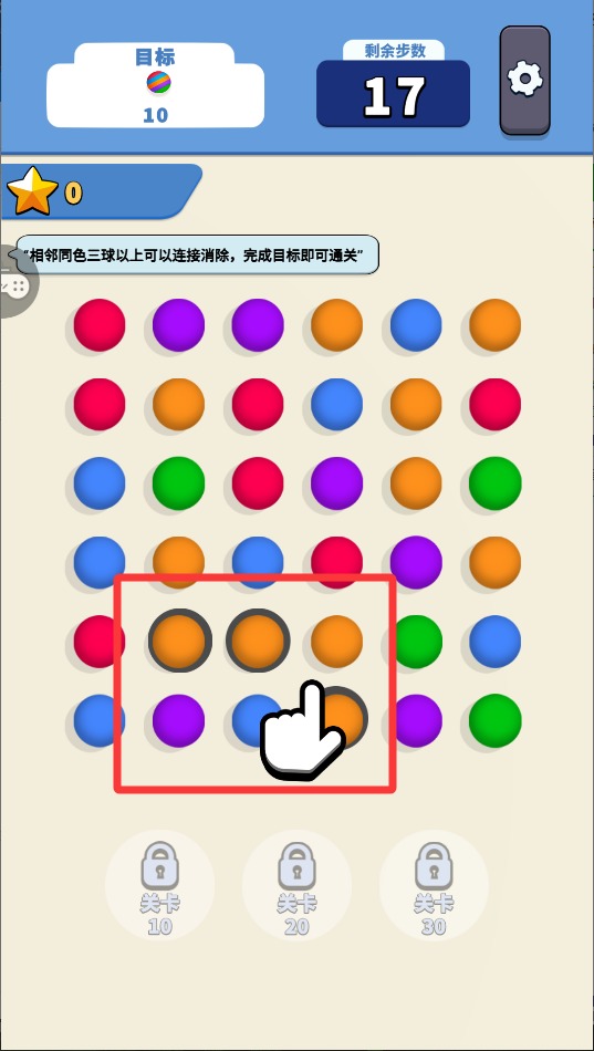 2、在屏幕上通过手指横向或竖向滑动,将相同颜色的球球聚集到三个及以上即可消除,相连的球球数量越多,分数加成越高。