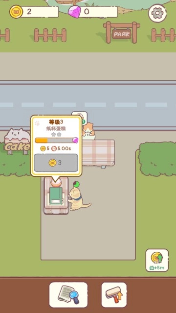 3、创建完成后,我们可爱的猫猫员工便会自动制作纸杯蛋糕并送给顾客,随即获得金币。在此之后,玩家需要持续消耗金币来对自己的工作台进行升级。
