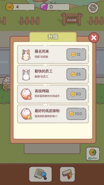 5、玩家能够通过点击升级按钮并消耗金币来招揽顾客。倘若资金充足,玩家还能为零食吧招聘员工,亦或是对烤箱、面粉进行升级,这些举措都能显著提高玩家的经营收益。