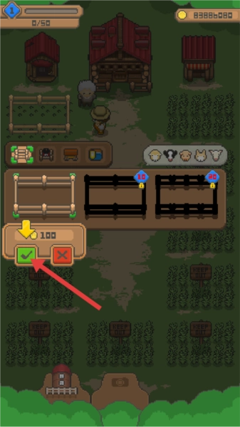 4. 选中围栏,点击绿色的对勾,耗费100金币来建造设施。