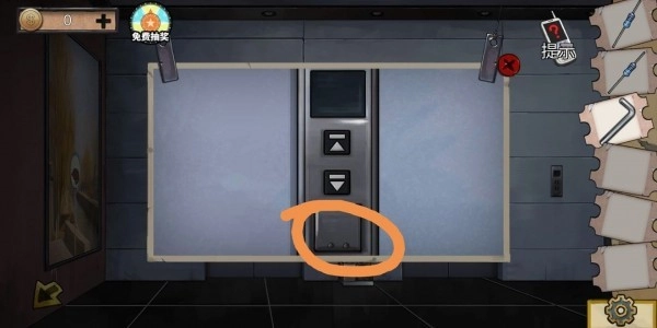 7、通过之后来到电梯间,在电梯门上捡到物品,用剪刀剪开图画,从中拿到六角扳手和电阻,接着在垃圾桶上也拿到一个电阻。