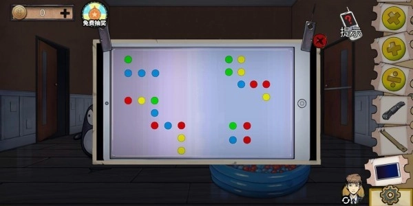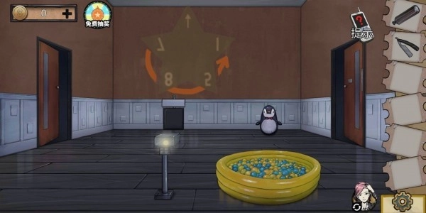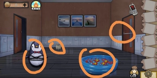 27、先在泡泡池子里找到4个黄色球,接着到墙边的背包里取出钥匙和平板,之后拿下企鹅身上的绳子。做完这些后返回第一个房间,用钥匙打开花瓶下方的柜子,从而拿到铁盒子。