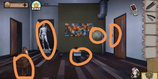 23、首先点击壁画下方的柜子,挪动木板获取手柄。接着点击上方的壁画,依据壁画上亮起的色彩,点击旁边与之对应的颜色按钮,随后拿到圆孔钥匙,前往左边的房间。在泡泡池中找到红色的球,从企鹅嘴巴里取出纸条,于洗手池边缘拿到剃刀。