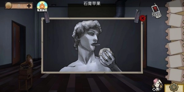 32、男主把苹果递给石像从而获得门卡,接着用门卡刷门禁,门禁开启后出现密码盘,随后男主在唱片机下方成功解开密码。