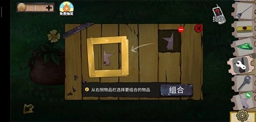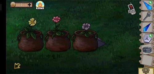 4、用左边的钥匙能够打开庭院的柜子,从中获取营养剂,将营养剂给予小黄花,即可得到半块塑料片组合。