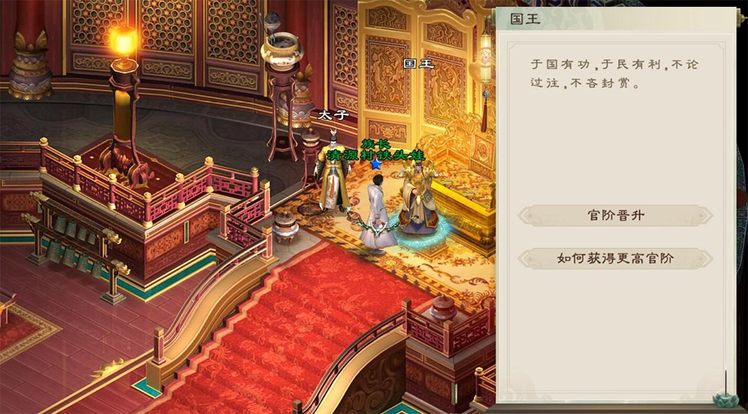 2、功勋值的用途:当功勋值积累达到下一等级官职所需条件时,可点击【前往晋升】,然后在国王处进行官阶晋升,进而获取更高的官阶属性、称号以及俸禄。
