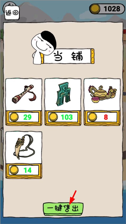3、玩家进入当铺后,背包里的古董物件会显示合理的估价,点击一键售出,就能卖出这些物件从而赚钱。