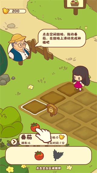 轻点空闲的土地,按住番茄并拖动,于田地上滑动即可完成种植操作。
