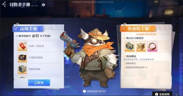 它有两个版本,分别为高级手册与典藏版手册,购买后使用其中道具便能快速升级。高级手册内包含猫头鹰宠物和60级+11强化券,当冒险等级达到30级,还会额外赠送55史诗装备盲盒、64个回路圣物盲盒,以及粉色冒险徽记带和奇馈礼盒。