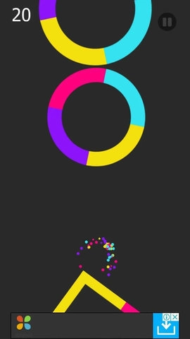 3、前方会出现多种颜色各异的圆环,玩家需要操控小球撞击与圆环颜色一致的部位,如此便能顺利通过。若小球撞击到其他颜色的部位,游戏即宣告结束。