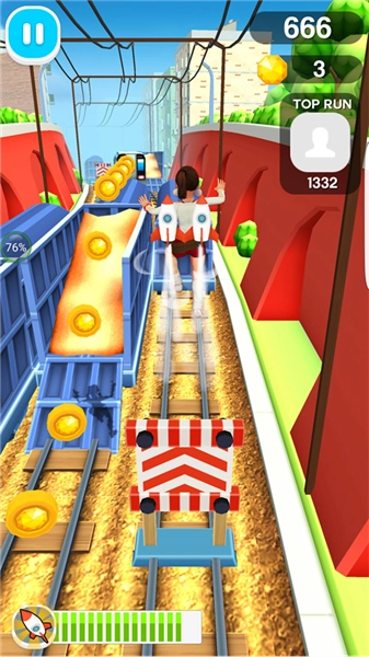 游戏目标为,既要尽可能跑得更远,又要在铁轨上收集尽可能多的金币。游戏视角设定为面向角色前行的方向。