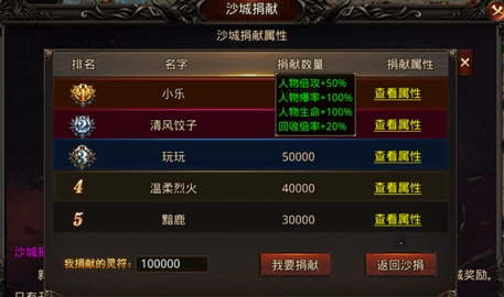 在土城右侧,点击【开启沙捐】,即可增添大量特殊属性,随后点击【捐献排行】。