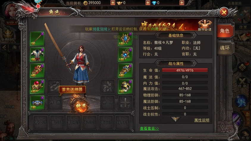 1通过消耗强化石与金币对装备进行强化,能够提升装备属性。不过,强化等级逐步升高时,成功的概率会随之降低。此时,可以搭配使用保护道具,以此防止强化失败导致等级下降。