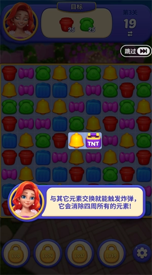 4当4到5个颜色相同的元素排列成L形状时,便可合成1枚炸弹。将炸弹与其他元素进行交换,就能触发炸弹效果,炸弹会消除其周围所有的元素。