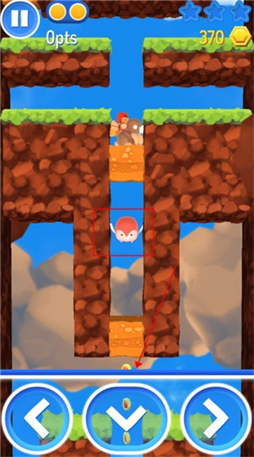 4、我们能够站在这种泥土块上,通过点击中间的下挖按键将其挖开,如此一来,我们就能向下移动。
