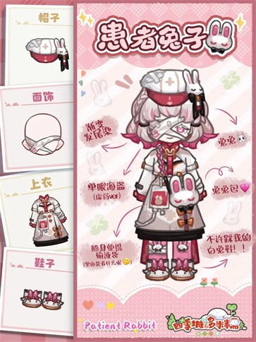 粉白色调搭配兔子形状的饰品,塑造出乖巧温顺的兔子模样,然而,渐变的白色毛发与输液袋组合,却无端给人一种看似单纯无害实则内里复杂的“白切黑”之感。