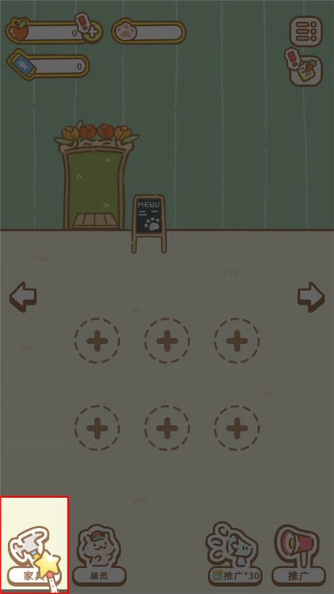 1、玩家进入游戏后,会发现店中一无所有,需先购置一些家具。