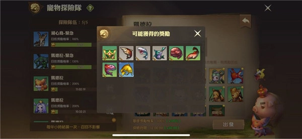探险队伍每次最多五组,点击白色礼物图标,就能查看可能获取的奖励。