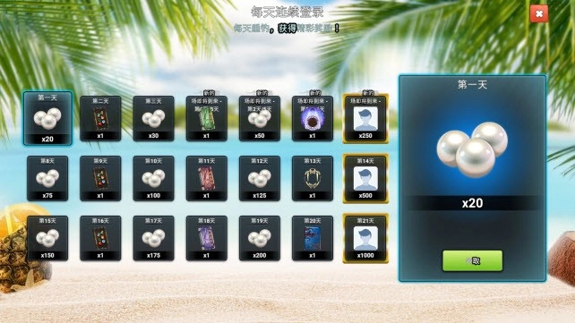 2、每日登录即可免费领取各类奖励,像珍珠、装饰之类。登录天数累计得越多,奖励就越丰厚。