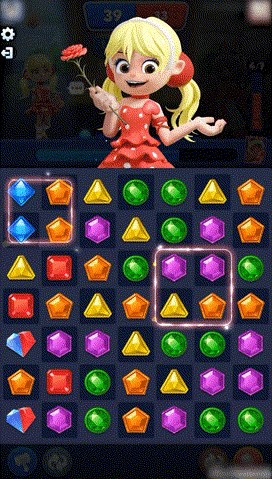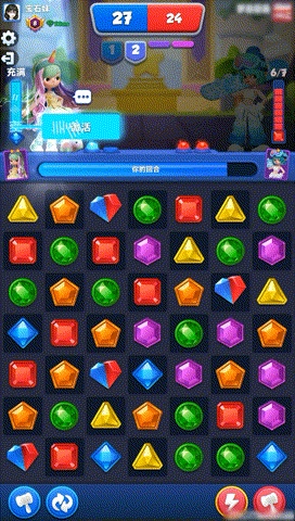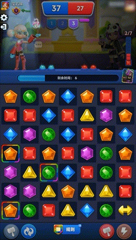 《宝石大乱斗》的操作棋面由 7*7 的49 个格子组成,其中随机分布 6 种颜色的宝石, 挑战者通过移动步数交换两个相邻的宝石,若 3 个及以上的同样颜色的宝石位于同一列或同一行这些宝石将被消除,每消除一个宝石得 1 分,对局结束后,分数高的玩家就是最后的胜利者啦~