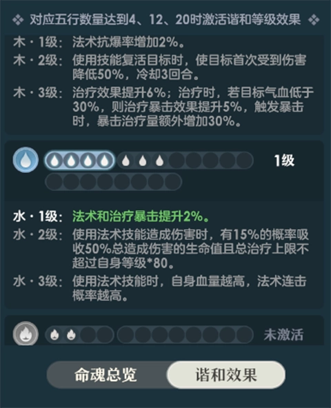 命魂所附加的属性会随机带有五行类型(金木水火土),当同一五行类型积攒到特定数量(4/12/20)时,就能激活相应等级的五行谐和效果。