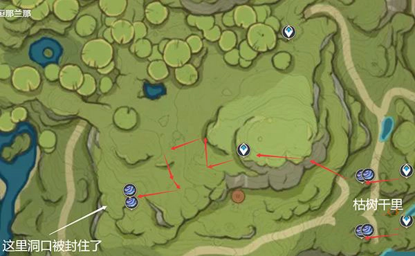 (1) 下图左边的路线之所以呈现弯曲状态,是因为途中有个山洞,沿着此路线走到尽头,就能看见一只仙灵。