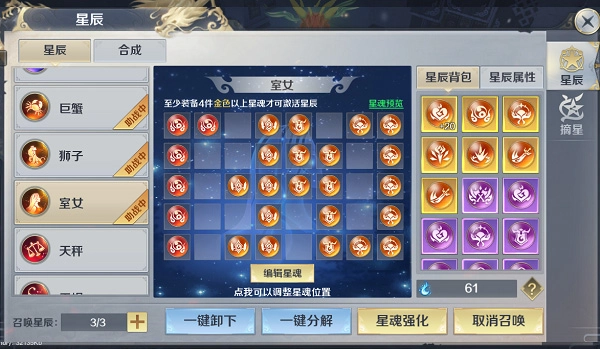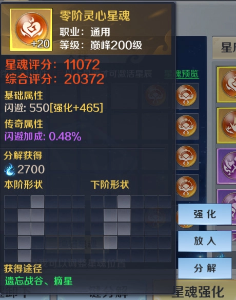 每颗星辰皆可强化至20级,强化所需的星辰精华,需通过分解其他低级且无用的星魂来获取。